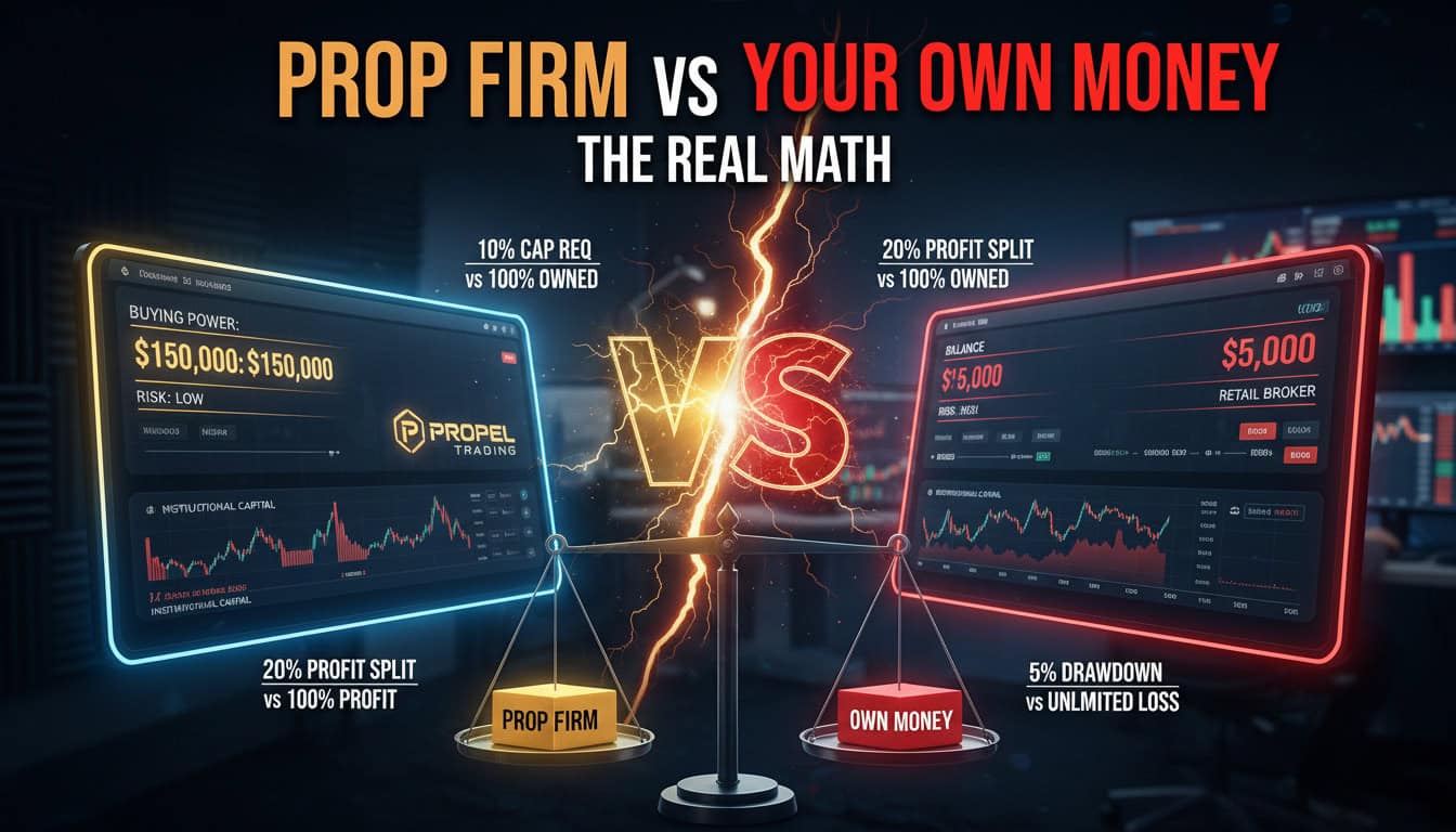 If you’re under $25K in trading capital and you have genuine skill, prop firms are probably the better path. If you’re over $50K and you can trade profitably, your own capital gives you more control and better long-term trajectory. If you’re somewhere in between, a hybrid approach makes the most sense.